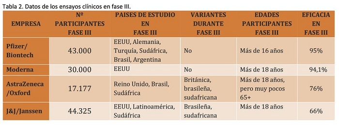 Como se observa en la tabla, la eficacia de las dos vacunas cuyos ensayos clínicos se realizaron más tarde (AstraZeneca/Oxford y J&J/Janssen), en presencia de nuevas variantes del virus, es menor. Por eso es difícil comparar la eficacia de las cuatro vacunas.