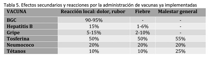 En la siguiente tabla vemos los efectos adversos más comunes de las vacunas que recibimos en España según el calendario de vacunación prescrito por las autoridades sanitarias. Son muy similares a los descritos anteriormente para las vacunas contra COVID-19. La diferencia es que la mayoría de ellas se nos administran cuando somos muy pequeños y no nos acordamos.