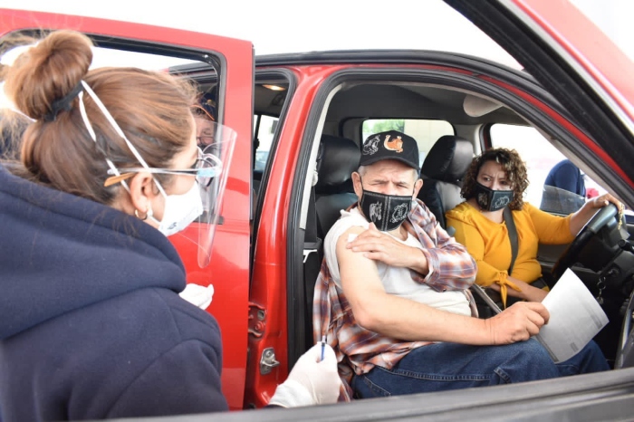 Esta mañana las autoridades sanitarias de esta entidad comenzaron a vacunar a las y los adultos mayores de 60 años que se presentaron en sus vehículos, sin la necesidad de que bajaran de los mismos.