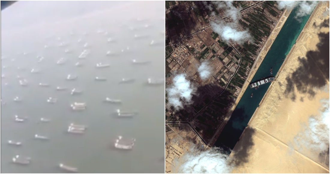 El "Ever Given", de 400 metros de eslora y 224 mil toneladas de capacidad de carga, quedó encallado en una orilla del canal y atravesado en el tramo sur, bloqueando el paso desde el mar Rojo al Mediterráneo y viceversa.