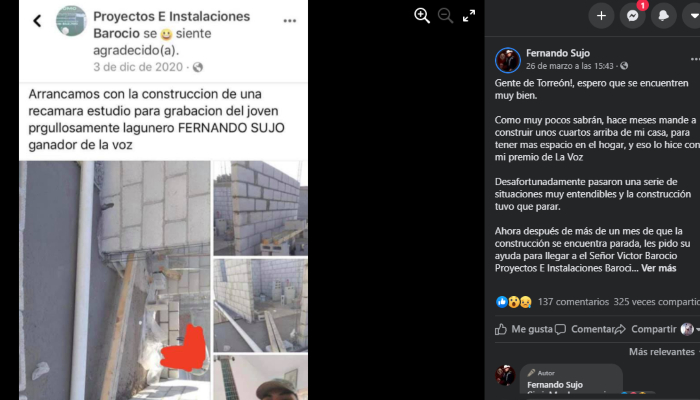 "Ahora después de más de un mes de que la construcción se encuentra parada, les pido su ayuda para llegar a el señor Víctor Barocio, de Proyectos E Instalaciones Barocio (su página de construcción), ya que nos ha sido imposible comunicarnos con él (nos tiene bloqueados a mí y a mi mamá). Hemos estado mandándole muchísimos mensajes en todas sus redes sociales, a su teléfono y a su teléfono de casa. Ya mi familia ha ido a buscarlo a su domicilio y no hay respuesta", recalcó.