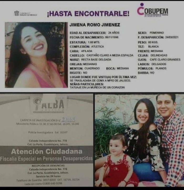 Fue el pasado 20 de marzo cuando Jimena Romo, de 24 años, salió de su casa en la capital de Jalisco en compañía de su esposo, Julio Villaseñor, y de su pequeña hija Julia Isabella, de 1 año y seis meses de edad.