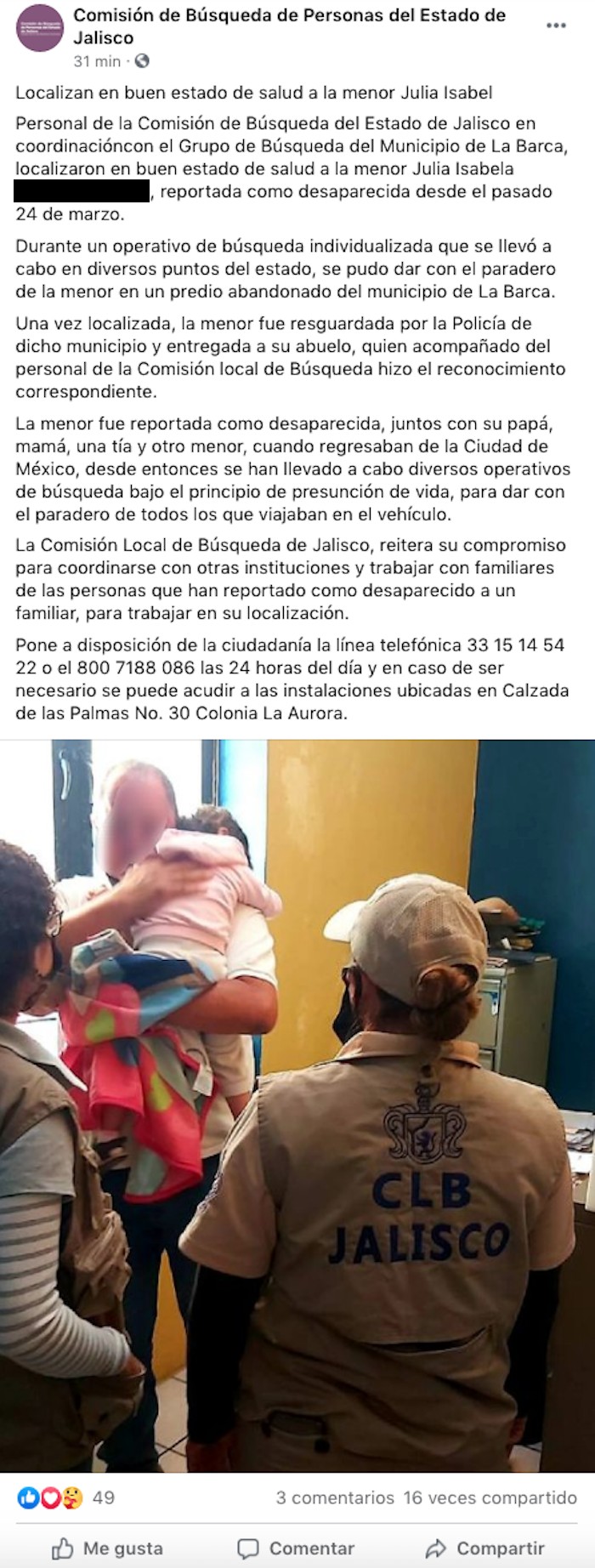 "Personal de la Comisión de Búsqueda del Estado de Jalisco en coordinación con el Grupo de Búsqueda del Municipio de La Barca, localizaron en buen estado de salud a la menor Julia Isabela", informó en una publicación a través de su página de Facebook.