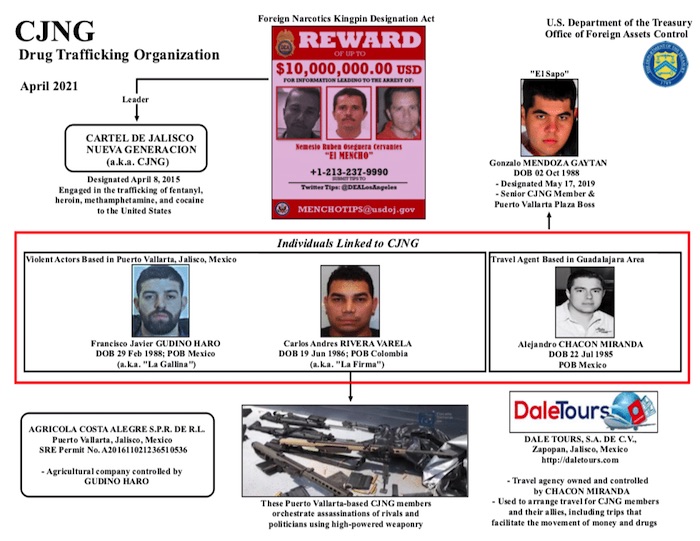 La OFAC también señaló a Alejandro Chacón Miranda, un agente de viajes basado en la ciudad de Guadalajara, como colaborador con la organización para presuntamente organizar viajes para el cartel y facilitar envíos de droga.