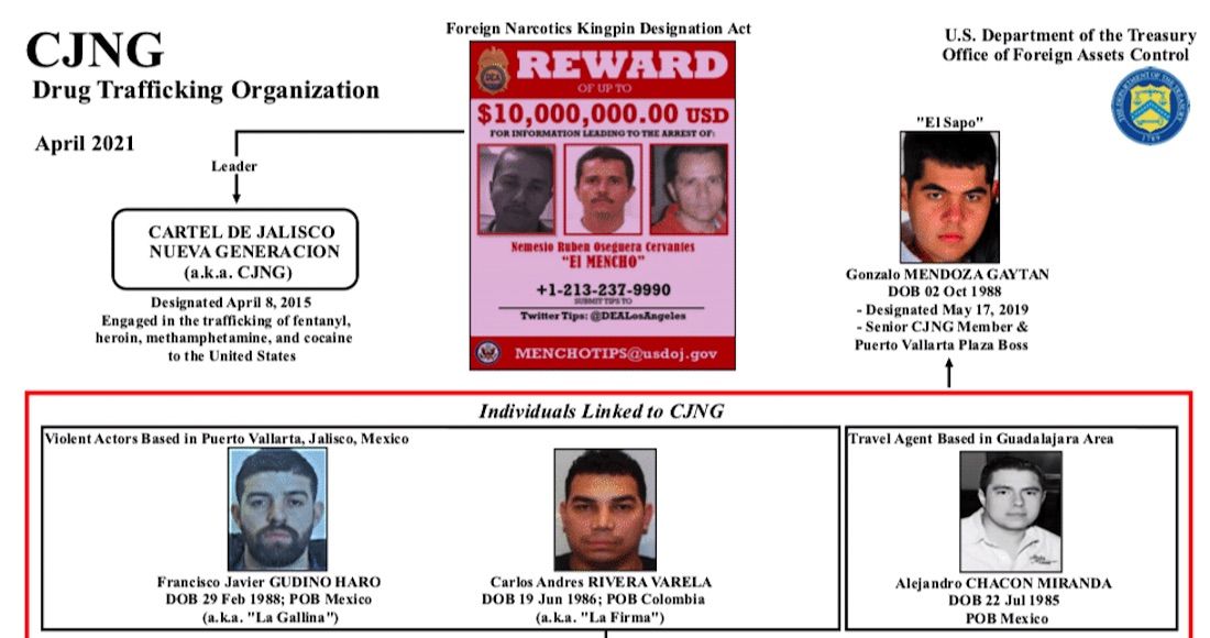 La Oficina de Control de Activos Extranjeros del Departamento del Tesoro de Estados Unidos (OFAC por sus iniciales en inglés) anunció el 6 de abril que había sancionado a Carlos Rivera Varela, alias “La Firma” y a Francisco Gudiño Haro, alias “La Gallina”. Ambos individuos, según la OFAC, proporcionaron asistencia para orquestar asesinatos en nombre del Cartel de Jalisco Nueva Generación (CJNG) en la zona costera de Puerto Vallarta, en el estado de Jalisco.