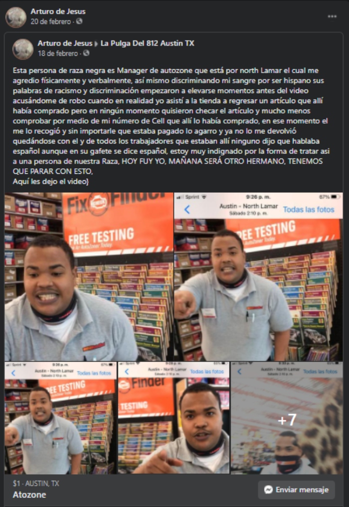 “Esta persona es manager de AutoZone que está por North Lamar el cual me agredió físicamente y verbalmente, así mismo discriminando mi sangre por ser hispano sus palabras de racismo y discriminación empezaron a elevarse momentos antes del video acusándome de robo cuando en realidad yo asistí a la tienda a regresar un artículo que allí había comprado", escribió en la red social.