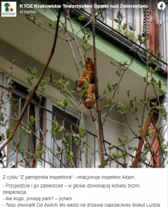 Polonia, 17 de abril (RT).- Una residente de la ciudad polaca de Cracovia llamó recientemente a la Sociedad Protectora de Animales para advertir de la presencia de una extraña "criatura" de aspecto peligroso que llevaba dos días colgando de un árbol cerca de su casa.