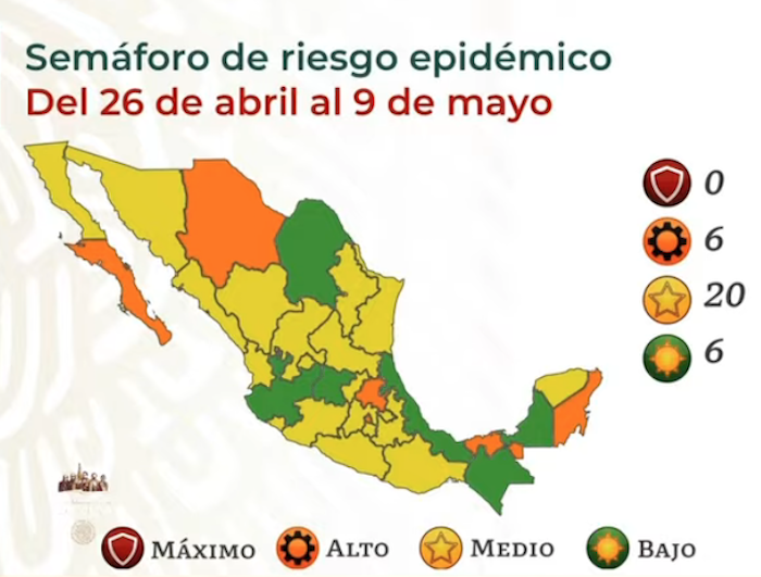 A partir del próximo lunes y durante las próximas dos semanas no habrá ningún estado en Semáforo Rojo (riesgo máximo de contagios), seis estarán en color Naranja (riesgo alto), 20 en Amarillo (riesgo medio), entre ellas la Ciudad de México, y seis en Verde (riesgo bajo).