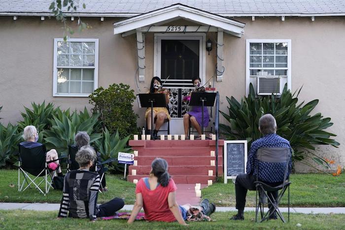 Cuando la primavera (boreal) dio paso al verano, comenzaron a surgir algunas formas de espectáculo. Fotografié a violinistas y pianistas aficionados que tocaban para los vecinos desde sus patios. Documenté estrenos de películas en autocines, conciertos en autocines, galas benéficas en autocines.