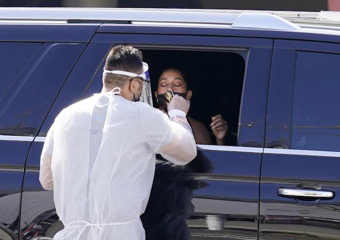 En los premios Emmy en septiembre, tuve que quedarme afuera y fotografiar los autos de los pocos asistentes en persona. Capturé a la actriz de “black-ish” Tracee Ellis Ross con un hisopo en la nariz en una imagen que define el momento.