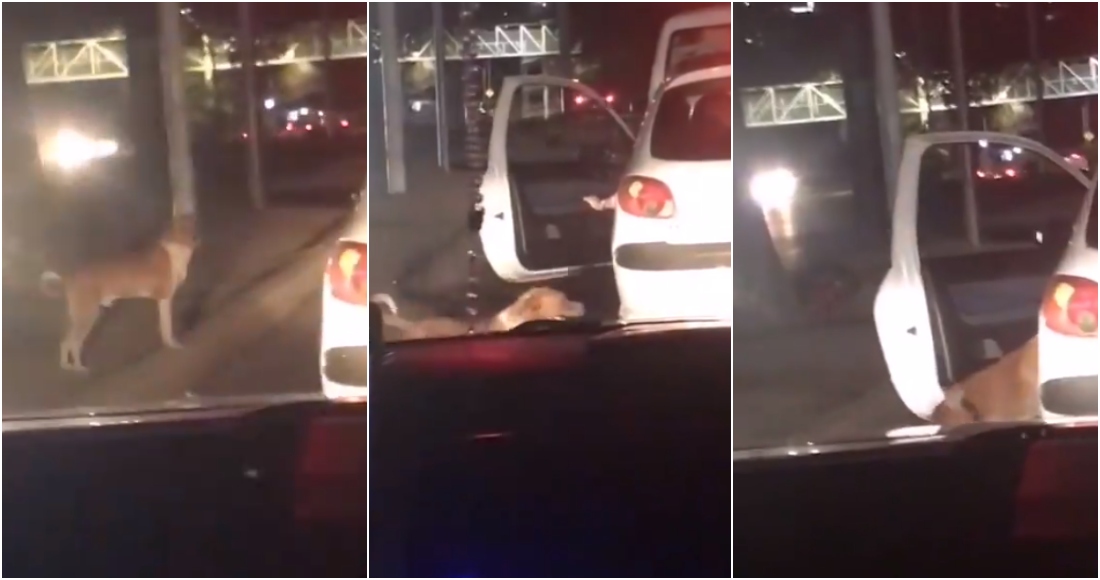 La videograbación que fue compartida en redes sociales, muestra cómo la persona que iba manejando llama al animal para subirlo a su coche aprovechando que el semáforo estaba en color rojo.