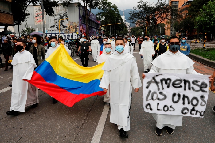 Incluso a las protestas de hoy en la capital se sumaron frailes dominicos que marcharon por las calles de la ciudad con una bandera de Bogotá y un cartel que decía "Ámense los unos a los otros".