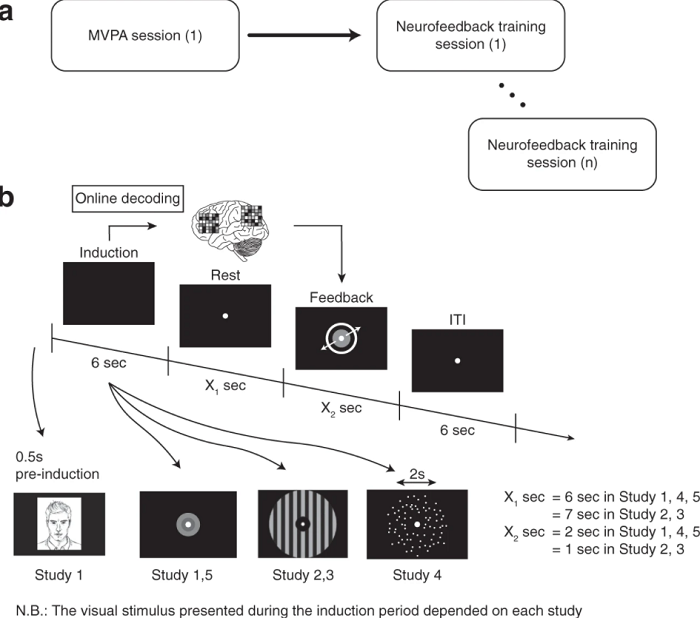 Descripción esquemática del diseño experimental. Foto: Cortese, A., Tanaka, S.C., Amano, K. et al. The DecNef collection, fMRI data from closed-loop decoded neurofeedback experiments. Sci Data 8, 65 (2021).