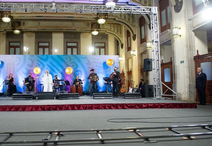 Acto seguido, el Presidente se hizo a un lado y cayó el telón y apareció Eugenia León con una banda de ocho músicos que arrancaron el concierto con las tradicionales "Las mañanitas".