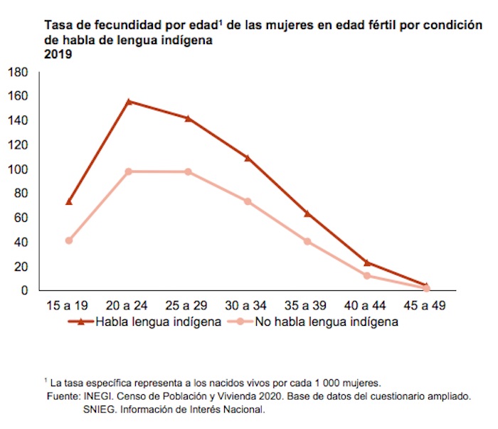 La tasa de fecundidad más alta por edad en 2019 se localizó en el grupo de 20 a 24 años en las mujeres que hablan lengua indígena. Mientras que en las mujeres que no hablan lengua indígena se extiende en los grupos de 20 a 24 y 25 a 29 años, según el Inegi.