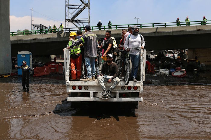 Personas intentado atravesar una inundación sobre los carriles de Periférico Sur a la altura de Cuemanco. Foto: Rogelio Morales, Cuartoscuro.