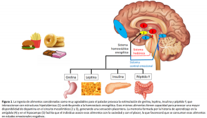 Como se observa en la Figura 1, la comida, y de forma más clara la comida rica en hidratos de carbono o grasas agradables al paladar (como los que aparecen en el lado izquierdo de la figura), interaccionan con el organismo a través de tres sistemas.