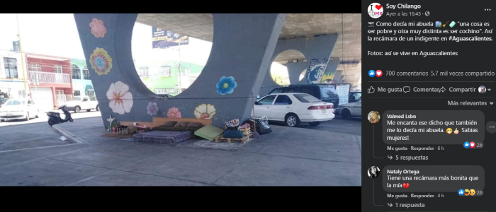 "Como decía mi abuela 'una cosa es ser pobre y otra muy distinta es ser cochino'. Así la recámara de un indigente en Aguascalientes", dice la publicación de Facebook.