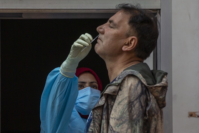 Una trabajadora sanitaria toma una muestra nasal a un hombre cachemir para una prueba de COVID-19 en Srinagar, en la Cachemira controlada por India. Foto: Dar Yasin, AP