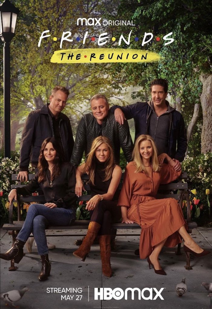 Posteriormente, se ve al elenco abrazándose en el plató y llegando al escenario de la fuente, aquella en la que los seis se lanzaban en los créditos iniciales mientras sonaba el tema "I'll Be There for You" de The Rembrandts. Allí parece que serán entrevistados por James Corden.