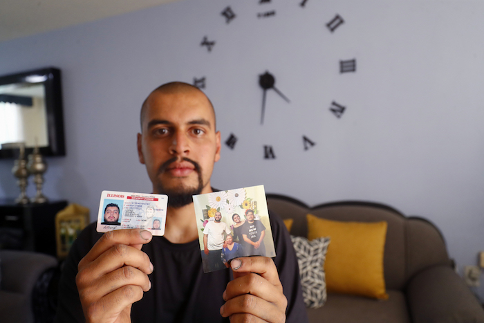 Jesús López, quien fue deportado por las autoridades de Estados Unidos el año pasado durante la pandemia del COVID-19, muestra su licencia de conducir de Illinois y una fotografía familiar en su casa en Zapopan, estado de Jalisco, el jueves 13 de mayo de 2021. Foto: Refugio Ruiz, AP.