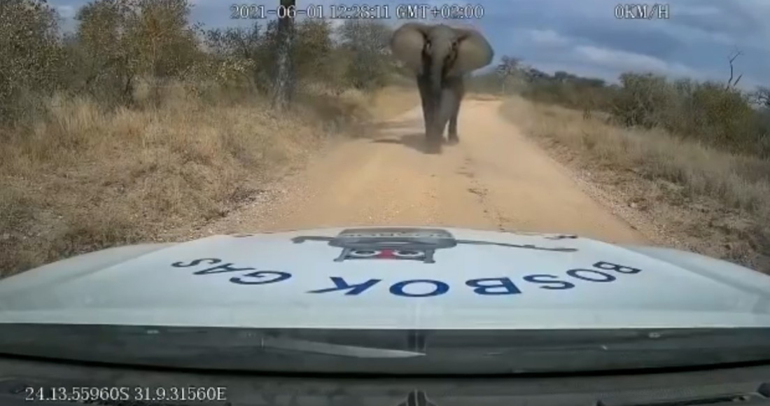 Ciudad de México, 6 de junio (RT).- Un empleado de una compañía de gas se vio sorprendido mientras realizaba entregas de combustible en las inmediaciones del Parque Nacional Kruger, en el norte de Sudáfrica, por un enfurecido elefante que embistió su vehículo de trabajo.