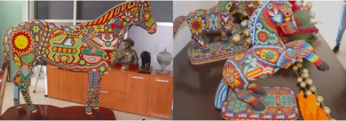Además de la silla de montar con incrustaciones también se encontraron piezas de arte wixárika, esculturas de animales y pinturas, según se pudo apreciar en las imágenes difundidas en aquel entonces.