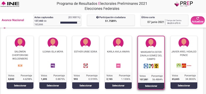 Con 137 mil 460actas capturadas, Zavala suma 107 mil 881 votos por 65 mil 665, o 34.3 por ciento, de su más cercano competidor, el abanderado de Morena, PT y Partido Verde, Javier Hidalgo.