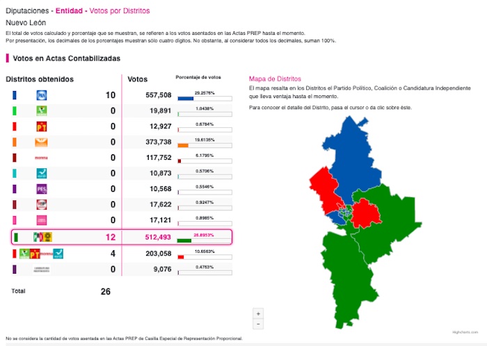 No obstante, las mismas cifras preliminares muestran que Samuel García tendría que gobernar con un Congreso en el que su partido no triunfó en ninguno de los 26 distritos electorales locales en juego. Por el contrario, el partido tricolor tendrá 12 diputaciones, seguido del Partido Acción Nacional (PAN) con 10 y la coalición conformada por Morena, PT, Partido Verde y Panal con cuatro distritos. Las 16 diputaciones en juego restantes corresponden al principio de representación proporcional, es decir con base al número de votos que obtuvieron los partidos, lo cual no bastaría para Movimiento Ciudadano.