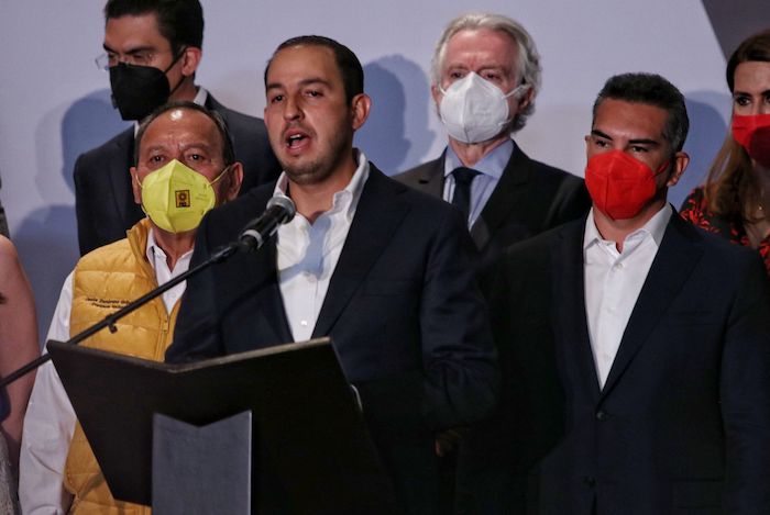 Los líderes nacionales Alejandro Moreno del PRI, Jesús Zambrano del PRD y Marko Cortés del PAN hablaron el 8 de junio sobre sus triunfos en las alcaldías de la Ciudad y los estados. Foto: Andrea Murcia, Cuartoscuro.