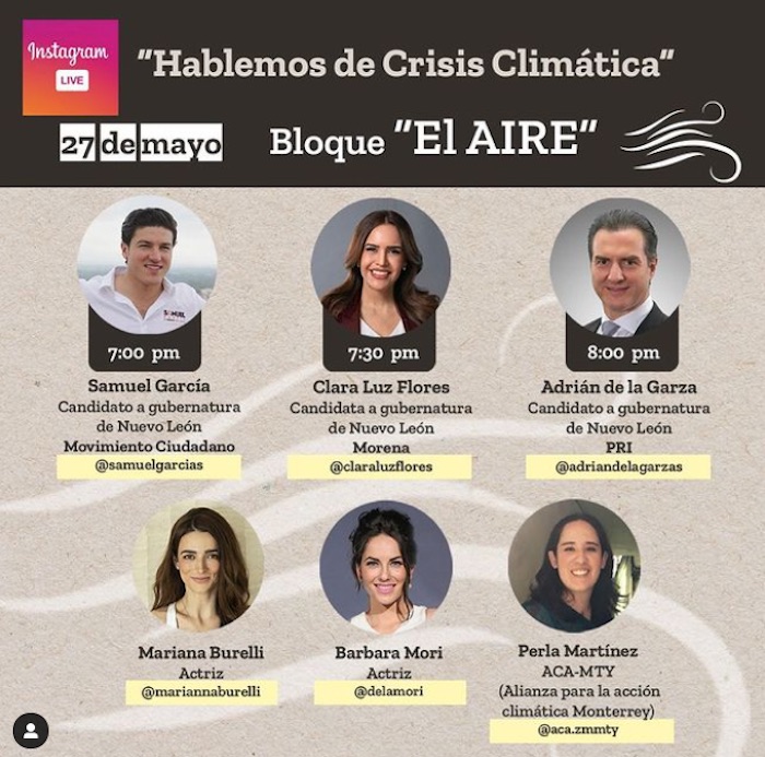 Gemma Santana, de VotoxelClima, añadió que la exigencia a legisladores se hará en eventos y visitas con apoyo de organizaciones locales o artistas que llevan años impulsando la agenda como Regina Rendón, Ilse Salas y Eugenio Derbez con campañas como #CuidemoselMar y "Salvemos a la Conanp", cuando se recortó presupuesto a la Comisión Nacional de Áreas Protegidas (Conanp).