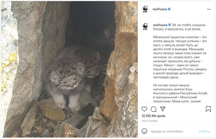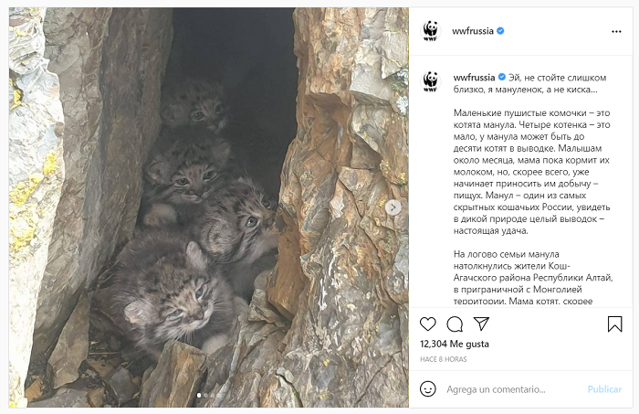 "El manul es uno de los felinos más sigilosos de Rusia; ver una cría en libertad es una verdadera suerte", explicó la organización, que se encarga de la conservación del medio ambiente.
