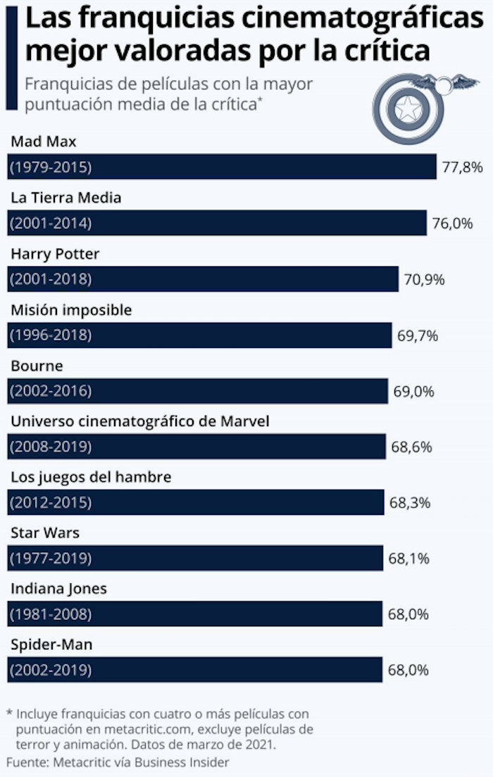 Por detrás de Mad Max, completando el podio, figuran La Tierra Media, que incluye El señor de los anillos y El Hobbit, y Harry Potter. Quizá puede resultar sorprendente que Misión Imposible figure en el cuarto puesto por delante de franquicias como la del MCU o de Star Wars. También destaca la presencia en el quinto lugar de Bourne o de Indiana Jones en el noveno puesto.