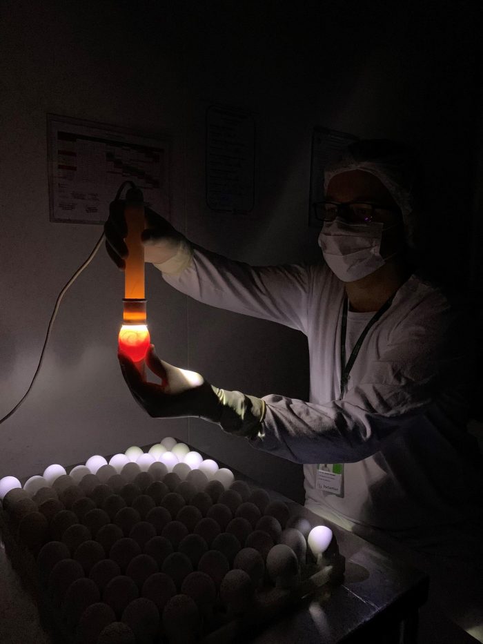 A este histórico laboratorio situado en Sao Paulo llegan cada día medio millón de huevos de gallina, los cuales son inspeccionados al detalle en un proceso llamado "ovoscopía" y en el que se evalúa la calidad de los embriones a través de la cáscara con la ayuda de una pequeña linterna.