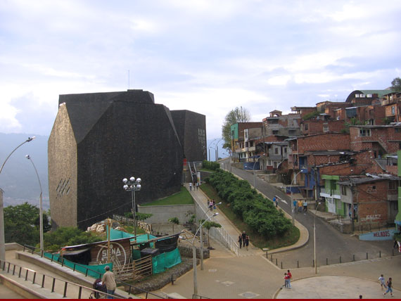 El edificio fue terminado en 2007 con la ayuda financiera del gobierno español y se divide en tres espacios: una biblioteca, un auditorio y un centro pedagógico. Está ubicada en el barrio de Santo Domingo. Un lugar en la montaña a 460 metros de altura al que antes era “imposible” acceder por su violencia y porque no había forma de hacerlo. Ahora un teleférico que mueve 35 mil pasajeros al día lo conecta con la ciudad y, del mismo modo, éste se une con el metro. Ahí donde antes había asesinatos constantemente y era imposible llegar para alguien de fuera, local o extranjero; Darwin y sus amigos, de entre seis y 15 años, sirven de guías a los turistas distraídos contando la historia de su barrio. Otros niños corren por los pasillos de la biblioteca, presentan obras de teatro en el auditorio y utilizan su ludoteca y computadoras, aunque la mayoría lo haga para jugar Mario Bros. El proyecto lo complementan dos nuevas escuelas públicas y un parque.
