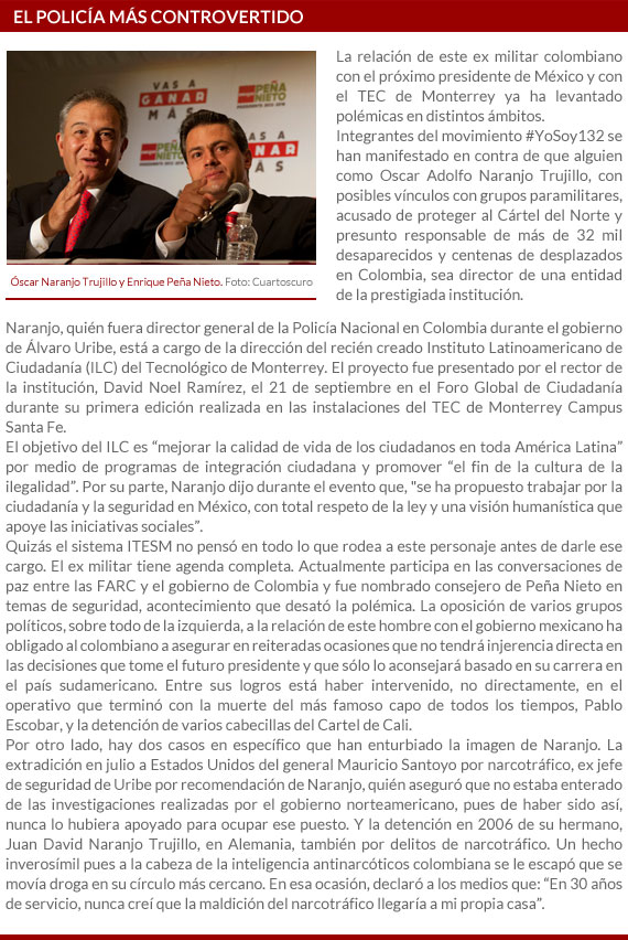 Además, el polémico ex militar radica en México –una figura contradictoria que divide en elogios y dudas a la prensa colombiana– y ha sido nombrado primer director del Instituto Latinoamericano de Ciudadanía (ILC) del TEC. Un proyecto dado a conocer el 21 de septiembre en el Foro Global de Ciudadanía en la Ciudad de México.