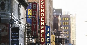 Teatros de la calle 45 en Nueva York el 13 de mayo de 2020. Foto: AP