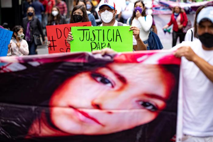 Este lunes, activistas se reunieron en la "antimonumenta" contra el feminicidio ubicado frente al emblemático Palacio de Bellas Artes, en el centro histórico de la capital y caminaron hasta la sede de la Fiscalía estatal acompañando a la familia de la víctima.