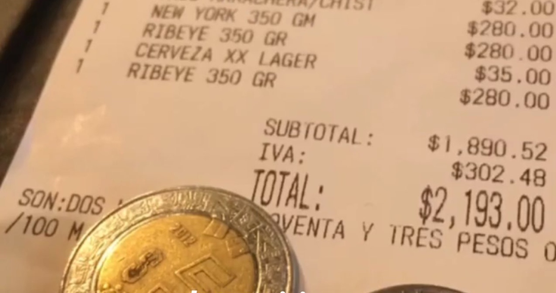 Sin embargo, aunque el pago del servicio fue por un total de mil 890, más un IVA de 302 pesos -cerrando en dos mil 193 pesos-, el mesero sólo recibió siete pesos de propina.