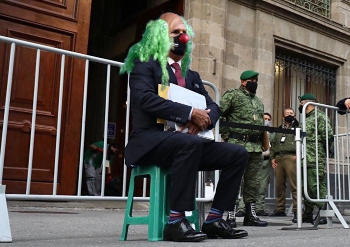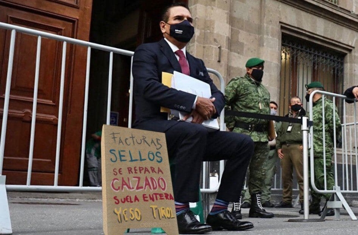 Aureoles estuvo parado afuera de Palacio Nacional y luego se sentó: le proporcionaron un banco de plástico. Allí le tomaron la foto, con sus calcetines multicolor y su fólder con “pruebas”.