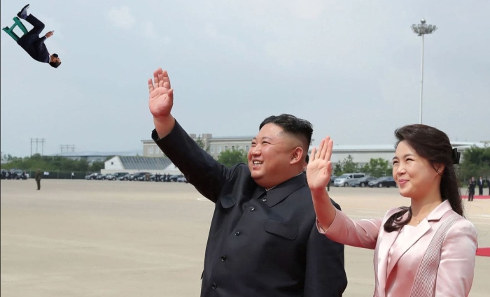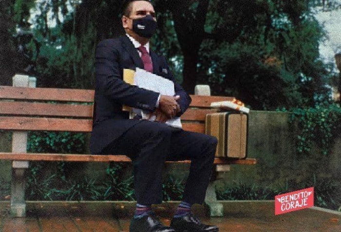 En la imagen se le ve de pie, a un lado de un banco color vede y custodiado por elementos de seguridad.