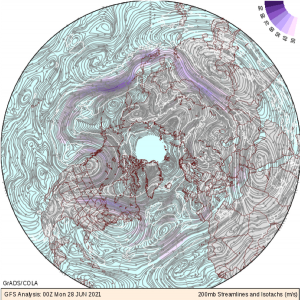 Hoy el Polo esta muy caliente. La situación de invierno equivale a la de hace décadas de verano. La situación de punto de máximo gradiente en verano se sitúa sobre Escocia, o entre la frontera entre Canadá y los EU y Alaska. Y el gradiente esta muy debilitado, porque con el Polo caliente, la diferencia de temperaturas con los trópicos es pequeña. La temperatura del Polo ha aumentado, pero la de los trópicos se mantiene porque allí que hay mucha agua: el calentamiento produce más evaporación, pero no aumenta la temperatura.