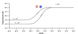 En invierno, ese punto de máximo gradiente se situaba, en la mitad del siglo XX, en la latitud de Marruecos, aquí. En la del norte de México en América. En verano, al calentarse la región polar, el punto se desplazaba en latitud hacia el norte, hacia el sur de Inglaterra, o la frontera entre los EU y Canadá.