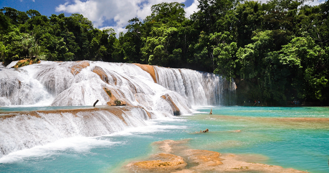 Las Cascadas de Agua Azul son consideradas cataratas y declaradas Reserva Natural de la Biosfera en 1980, se forman de los afluentes de los ríos Otulún, Shumuljá y Tulijá formando cañones no muy profundos con acantilados verticales que dan origen a sus cascadas blanquiazules.
