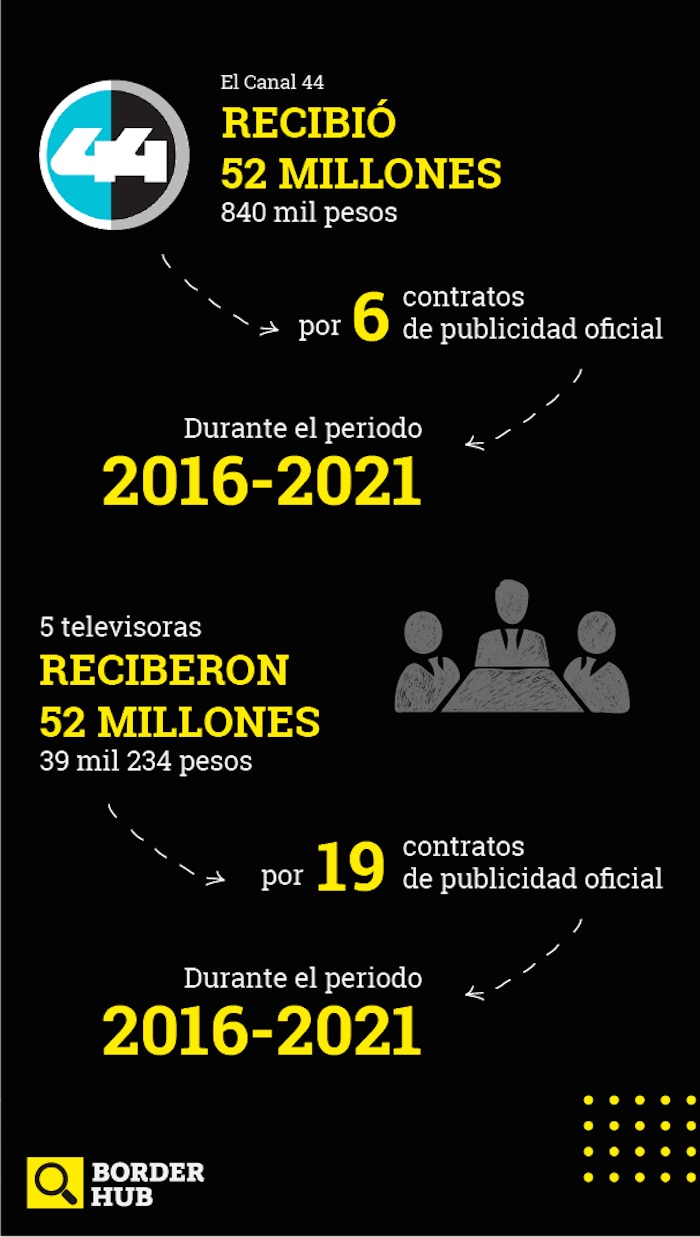 Durante el mismo periodo, el municipio otorgó otros 19 contratos a cinco televisoras locales por un monto total de 52 millones 039 mil 234 pesos, es decir, que Canal 44 recibió 800 mil 766 pesos más que todas las televisoras juntas, demostrando así un favoritismo por la empresa de sus padres.
