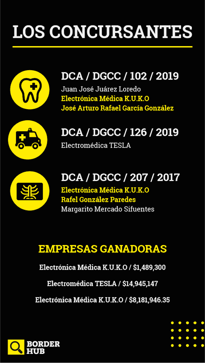 La licitación del contrato DCA/DGCC/102/2019 para la compra de equipo médico dental tuvo como participantes a la empresa Electrónica Médica K. U. K. O. y a José Arturo Rafel García Chávez, este último es a su vez accionista de K. U. K. O.