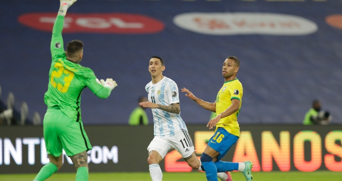Rodrigo de Paul se apoderó de un balón perdido por Renan Lodi y entregó desde detrás del medio campo un estupendo y largo pase a Di María, quien se libró apenas del fuera de juego, controló y tocó por arriba ante la salida del arquero Ederson a los 22 minutos.