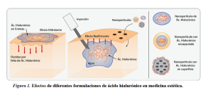 ¡Pero, ojo! Hay que tener en cuenta que la piel es la primera barrera de protección que tenemos contra el exterior y se podría comparar con un escurridor de pasta. Los “tallarines” de hialurónico son demasiado grandes y enmarañados como para atravesar los pequeños poros de “nuestro escurridor natural”. Por tanto, el ácido hialurónico de la mayoría de las cremas antiedad quedará en la superficie, donde aportará hidratación y suavidad, pero no turgencia, para lo cual serían necesarias inyecciones o añadirlo en forma de partículas lo suficientemente pequeñas como para atravesar dichos poros, distinguiendo nanopartículas hechas de este compuesto, las que lo llevan en su superficie y las que lo encapsulan en su interior (Figura 1).
