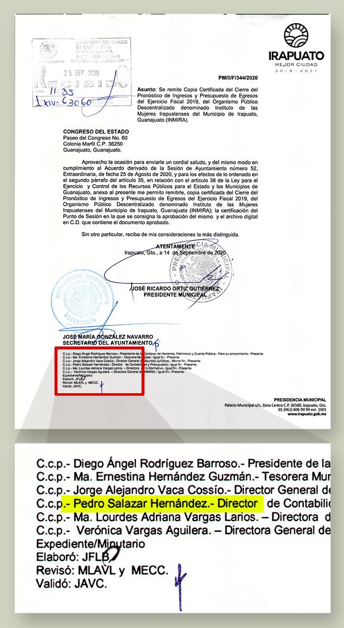 También está el caso de reincidencia de Pedro Salazar Hernández. Entre 2017 y 2018 —en calidad de director general de Finanzas del municipio de Irapuato— fue inhabilitado en cuatro ocasiones por el Gobierno de Guanajuato. A ello se sumarían dos inhabilitaciones más en 2019, con lo que Salazar acumuló tres cargos por negligencia administrativa y tres cargos por violación a leyes y normatividad presupuestales. Pese a que Salazar debió de haber estado inhabilitado desde el 4 de diciembre de 2018 hasta el 26 de septiembre de 2021, un documento oficial indica que en 2020, Salazar laboró como director de Contabilidad y Presupuesto del Ayuntamiento de Irapuato.