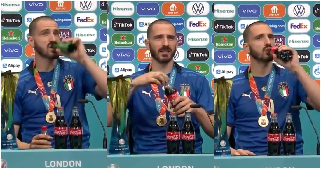 Semanas después de la polémica generada luego de que el portugués Cristiano Ronaldo hiciera a un lado dos botellas de Coca-Cola y recomendara beber agua, el defensa italiano hizo todo lo contrario y decidió darle un par de tragos a las bebidas en frente de todos los reporteros.